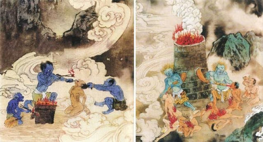 When Sun WuKong is under the mountain, he’s fed “iron pellets when he’s hungry and molten copper when he’s thirsty” (Wu &Yu, Chapter 14). Even by deity standards, this would be considered cruel punishment. Given that he is already smooshed by a mountain, most western audiences would find this an extreme punishment.