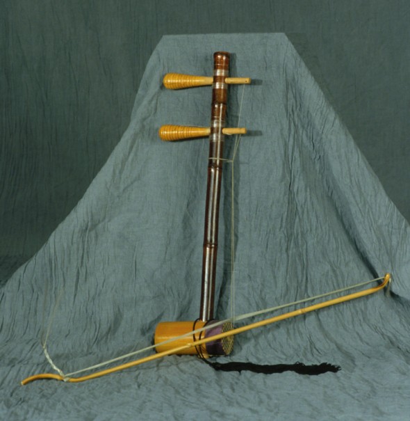 The Hu Qin is the general term for all bowed, stringed instruments in the opera orchestra. This one is a two-stringed instrument, and like its brothers and sisters, the bow is actually attached to the instrument.